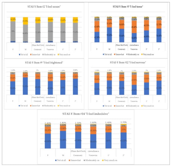 We performed a qualitative analysis of the items of scale 1 of the STAI-Y that were found to be the most significant (p = 0.01) in reference to the stressful event “vaccination”. In this specific case, as shown in Table 6, we evaluated items related to the feeling of security and states of anxiety, tension, fear, nervousness, and indecision, looking for any differences between the sexes, type and dose of vaccine received, as well as any percentage differences in the answers obtained between the different categories under examination (see Figure 3). The results showed that, when investigating whether they feel secure with respect to vaccination, 78% of women responded with “moderately so”, compared with only 66.9% of men, who had a higher percentage (29.7%) in the answer “very much so” compared to women (16.2%). Considering the type of vaccine, 23.5% of those who received Comirnaty (Pfizer-BioNTech) responded with “very much so” (Vaxzevria (AstraZeneca) = 18.6%), and there were no obvious differences between the first and second received doses. States of tension, nervousness, fear, and indecision were more frequent in women, who reported higher percentages than men in the answers “somewhat” and “not at all”. Obvious differences were also observed for the type of vaccine inoculated, as those who vaccinated with Vaxzevria (AstraZeneca) reported higher states of tension (“very much so” = 3.2%; Comirnaty (Pfizer-BioNTech) = 2.1%), being frightened (“somewhat” = 30.4%; Comirnaty (Pfizer-BioNTech) = 23%), nervousness (“somewhat” = 43.9%; Comirnaty (Pfizer-BioNTech) = 27.5%), and indecision (“moderately so” = 9.5%; Comirnaty (Pfizer-BioNTech) = 6.1%). The state of tension that emerged to varying extent between the first and second dose administrations is also relevant: subjects reported a higher level of tension (“somewhat” = 40.7%; second dose = 32.7%) and nervousness (“somewhat” = 33.8%; second dose = 26.8%) in the first administration.