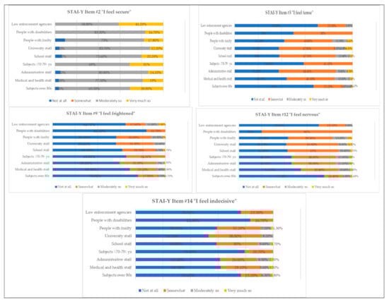 Percentage of response frequencies related to the clinically significant items of STAI-Y divided by vaccine priority ministerial categories.