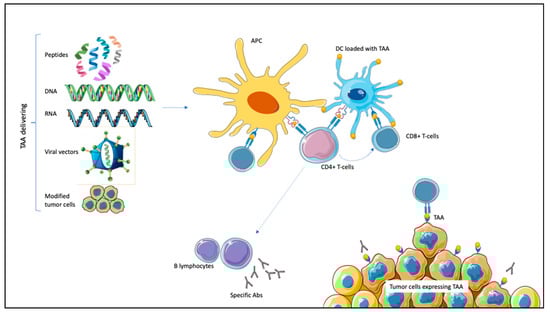 Mechanism of action of therapeutic vaccines in genitourinary malignancies. Tumor-associated antigens (TAAs) are expressed on tumor cells. TAAs can be delivered by different mechanisms (peptides, DNA or RNA encoding TAAs, and viral vectors carrying TAAs or modified tumor cells), leading to antigen-presenting cells (APCs) activation. Dendritic cells (DCs) are themselves APCs and can be loaded with TAAs. After antigen processing, APCs interact with CD8+ T-cells through class I major histocompatibility complex (MHC), inducing specific cytotoxic responses against TAA-expressing tumor cells. Through class II MHC, APCs activate CD4+ T-cells. CD4+ potentiate CD8+ activation; moreover, they induce B-lymphocytes activation for specific antibodies (Abs) production against TAA-expressing tumor cells.