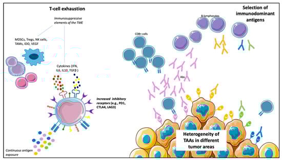 Possible mechanisms limiting vaccines’ efficacy. (1) T-cells exhaustion: the continuous antigen exposure, together with cells (e.g., myeloid-derived suppressor cells (MDSCs), tumor-associated macrophages (TAMs), natural killer (NK) cells and Treg cells), cytokines (e.g., interferon (IFN), interleukin (IL)-6, IL10, transforming growth factor (TGF)-β) and other soluble factors (e.g., vascular endothelial growth factor (VEGF) and indoleamine-pyrrole 2,3-dioxygenase (IDO)), results in loss of function of T-cells, with an increased expression of inhibitory receptors (e.g., programmed death (PD)-1, cytotoxic T-lymphocyte antigen (CTLA)-4, lymphocyte-activation gene (LAG)-3) on T-cells surface. (2) Heterogeneity of tumor-associated antigens (TAAs) in different tumor areas: a particular vaccine could not target all the tumor areas. (3) Selection of immunodominant antigens capable of triggering a robust immune response (of note, the frequency of an antigen does not correlate with its immunogenicity).