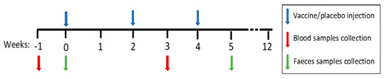 Study samples collection. Weeks −1 and 0 corresponded to the baseline of the study, and weeks 3 and 5 corresponded to the postvaccination points. Feces samples were collected at week 0 (baseline) and week 5 (postvaccination), indicated by the green arrows. Blood samples were collected at week −1 (baseline) and week 3 (postvaccination), indicated by the red arrows. The vaccine or placebo were injected at weeks 0, 2, and 4, indicated by the blue arrows.