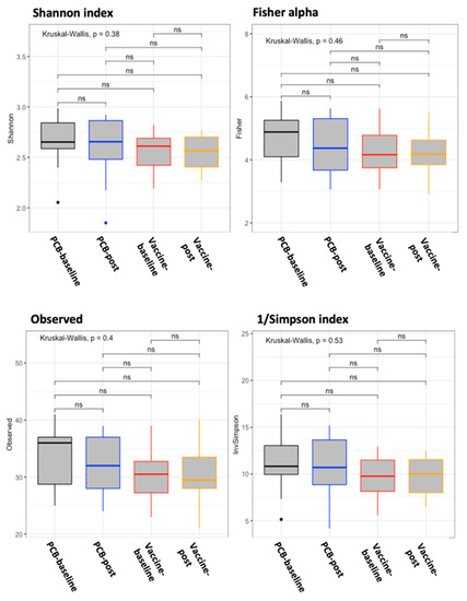 Alpha diversity by randomization group at different time points. Placebo (PCB) baseline (week 0) samples were represented in the black boxes, PCB post-vaccination in the blue boxes, vaccine baseline samples in the red boxes, and post-vaccination (post, week 5) samples in the orange boxes. Left-top: Shannon index, right-top: Fisher alpha index, left-bottom: number of observed OTUs, and right-bottom: inverse Simpson (1/Simpson) index. Box plots represent the median (black horizontal line), 25th, and 75th quartiles (edge of boxes) and upper and lower extremes (whiskers). For every parameter, the global Kruskal–Wallis p-value and the p-values for every comparison between the randomized groups at different time points are presented. p-Values code: p < 0.005: ***, p < 0.01: **, p ≤ 0.05: *, and p > 0.05: ns.