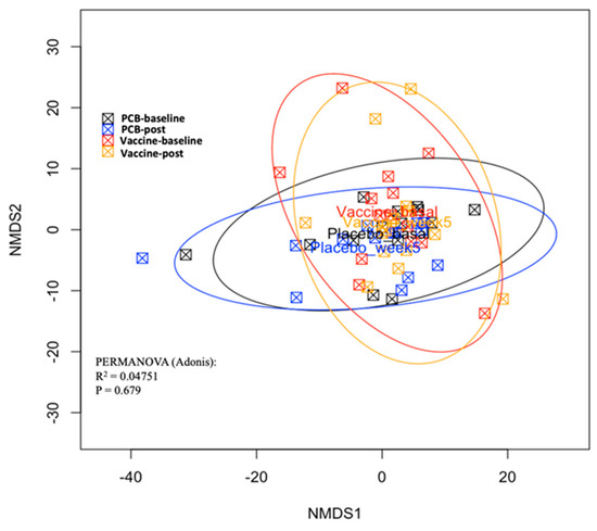 Principal coordinates analysis (PCoA) by randomization group. Placebo (PCB) baseline (week 0) samples were represented by the black squares, PCB post-vaccination (post, week 5) by the blue squares, vaccine baseline (week 0) samples by the red squares, and postvaccination (week 5) samples by the orange squares. The PCoA plot was obtained using the Bray–Curtis distances to visually analyse the beta diversity. These distances were based on dissimilarities in the microbiota profile of each subject. In the PCoA graph, each subject is shown as a square. The distances between the squares represent the differences in the microbiota composition between subjects. It is used to mathematically measure the involvement of groups in the beta diversity we performed in the Adonis test. p-Values code: p < 0.005: ***, p < 0.01: **, p ≤ 0.05: *, and p > 0.05: ns.It indicated that there were no differences in the beta diversity between the randomization groups (vaccine or placebo) at any time point analyzed. R package: vegan.