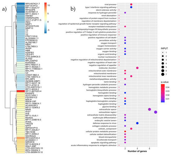 RNAseq transcriptomic analysis. (a) Heatmap of the fold change of the differential expressed genes between responder and non-responder individuals. The differential expressed gene symbol obtained from Ensembl genecode were showed in the vertical axis. The positive values (red scale colors) correspond to the upregulated genes in responder subjects, and the negative values (blue scale colors) correspond to the downregulated genes in responder subjects. The differential expressed genes were obtained using the ANOVA test, and a p-value < 0.05 was considered significant. (b) Enrichment analysis of the differential expressed genes in the responder group. The functional annotation was obtained using KOBAS software and the Gene Ontology (GO) database. The differential expressed pathways with q-value < 0.05 were considered significant. Patients were considered as responders with a delta VL set point >0.5 log10 copies/mL.