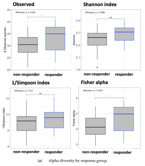 Gut microbiota composition analysis by response effect. (a) Alpha diversity by response effect group. Black boxes represent the non-responder group, and blue boxes represent the responder group. Left-top: number of observed OTUs, right-top: Shannon index, left-bottom: Fisher alpha index, and right-bottom: Simpson index. Box plots represent the median (black horizontal line), 25th, and 75th quartiles (edge of boxes) and upper and lower extremes (whiskers). Outliers are represented by a single data point. For every parameter, the global Kruskal–Wallis p-value and the p-values for every comparison between the randomized groups at different time points are presented. p-Values code: p < 0.005: ***, p < 0.01: **, p ≤ 0.05: *, and p > 0.05: ns. (b) LefSe analysis to detect the enriched bacteria at the phylum (p_) level between responder and non-responder subjects. (c) LefSe analysis to detect the enriched bacteria at the genus (g_) level between responder and non-responder subjects. Patients were considered as responders with a delta VL set point >0.5 log10 copies/mL.