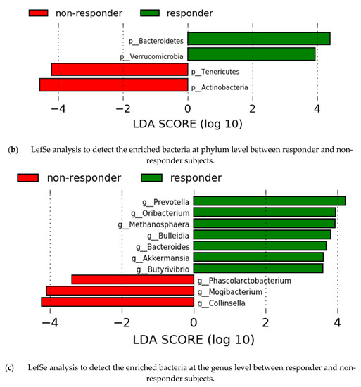 A TGUT microbiome analysis was performed using the obtained relative abundances at the phylum and genus levels. Higher richness and diversity were detected in responders than in non-responders (Observed, p = 0.033; Fisher alpha, p = 0.021; Figure 5a). The LEfSe analysis revealed differences at the phylum level between groups: responders were enriched in Bacteroidetes (p < 0.005) and Verrucomicrobia (p = 0.017), while non-responders were enriched in Tenericutes (p = 0.049) and Actinobacteria (p < 0.005) (Figure 5b). We also found differences at the genus level between responders and non-responders in the LEfSe analysis. Responders showed enriched levels of Bacteroides, Prevotella, Oribacterium, Methanosphaera, Bulleidia, Akkermansia, and Butyrivibrio. By contrast, non-responders showed enriched levels of Phascolarctobacterium, Mogibacterium, and Collinsella (Figure 5c). Additionally, LASSO regression was performed to inspect the contribution of the response groups to the model (area under the receiver operating curve = 0.64).