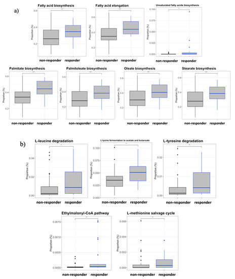 The PICRUSt2 analysis to predict the metagenomic functional content of the gut microbiota revealed significant differences between the responder and non-responder groups at the KEGG level III. Specifically, the predicted pathway of amino acid metabolism for short-chain fatty acid (SCFA) production was increased significantly in the responders (Figure 6a), leading to L-leucine degradation, L-lysine fermentation to acetate and butanoate, L-methionine salvage cycle induction, and L-tyrosine degradation and ethylmalonyl-CoA pathway induction. In addition, an important increase in fatty acid biosynthesis was detected in responders that was absent in non-responders. Thus, the saturated and unsaturated fatty acid biosynthesis pathways were affected, including those of some long-chain fatty acids, such as palmitate (C16), oleate (C18), and stearate (C18) biosynthesis (Figure 6b).