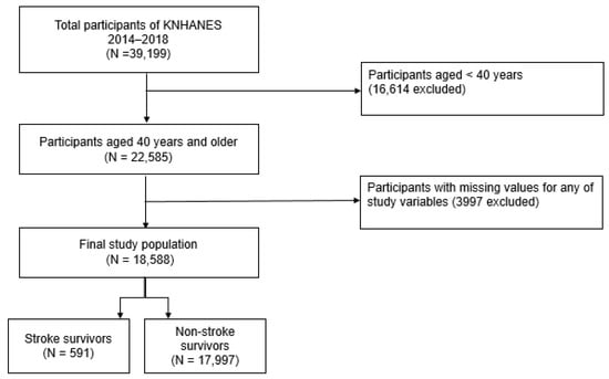 The present study was conducted using data from the Korea National Health and Nutrition Survey (KNHANES) between 2014 and 2018. The KNHANES, a nationwide cross-sectional survey examining the non-institutionalized civilian Korean population, has been performed annually by the Korea Centers for Disease Control and Prevention (KCDC) since 1998. It offers extensive information on individuals’ sociodemographics, health status, and health behaviors. The KNHANES participants are selected through complex, stratified, multi-stage, and probability sampling to provide nationally representative and non-biased data. Further information regarding the validity and representativeness of the KNHANES has been documented in previous studies [24,25]. Among the 39,199 total participants of the KNHANES 2014–2018, those aged less than 40 years were excluded (N = 16,614). Participants with missing data on any of the study variables, including those who did not respond to questions about the status of influenza vaccination and previous diagnosis of stroke, were also excluded (N = 3997). Subsequently, 18,588 participants were selected as the study population. Participants were then dichotomized into those with (N = 591) and without (N = 17,997) a history of stroke (Figure 1). Participants were considered stroke survivors if they responded positively to a prior diagnosis of stroke by a physician. The Institutional Review Board of the Seoul St. Mary’s Hospital, Catholic University of Korea (approval number: KC21ZASI0138) approved this study, and the requirement for written informed consent was waived.