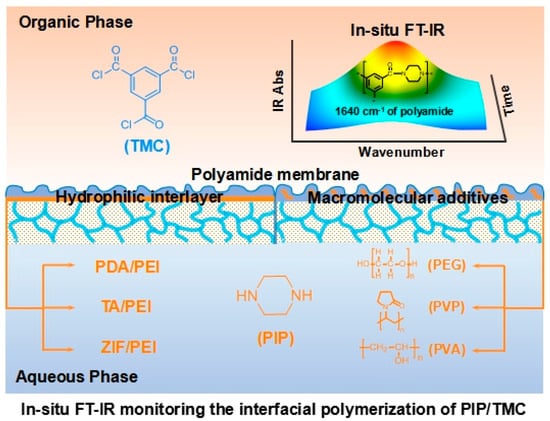 A typical IP reaction is usually finished in 0.5–2.0 min, because of the fast and uncontrollable IP reaction. In this work, hydrophilic interlayers and macromolecular additives were used to reduce the IP reaction rate for in situ FT-IR spectroscopy analyzing (as schematically shown in