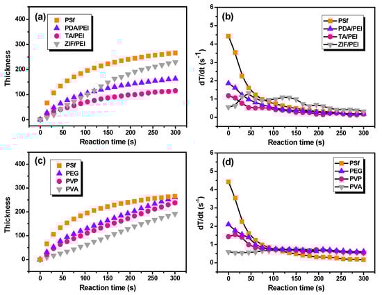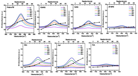 Figure 2 shows that the in situ FT-IR spectra monitored the IP reaction on the pristine PSf porous substrate, which nicely complied with the traditional growth principle. Usually, in situ FT-IR can be used to monitor a reaction for several hours; in this case of a fast IP reaction, the monitoring time was fixed between 0–300 s, with the minimum interval of 15 s. In other circumstances, the IP reaction rates are obviously repressed, in the condition of the introduction with hydrophilic interlayers and/or macromolecular additives. The reason for the repression phenomena could be possibly attributed to the slowed-down PIP diffusion rates, which were studied and acquired from the ultraviolet spectroscopy (UV-VIS) analyses for the 10 min diffusion time of PIP from water to hexane, as shown in