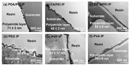 Figure 4 shows that the thickness of polyamide layers decreased noticeably with the introduction of interlayers and/or macromolecular additives. The ascertained thickness of polyamide layers obtained from the TEM images were at the sequence of 138 ± 24 nm (PSf) > 95 ± 7 nm (PEG) > 84 ± 17 nm (PVP) > 76 ± 19 nm (PVA) > 71 ± 3 nm (PDA/PEI) > 60 ± 6 nm (ZIF-8/PEI) > 46 ± 2 nm (TA/PEI). Furthermore, the as-formed polyamide layer surface morphologies and the roughness were observed and evaluated by the FESEM images (