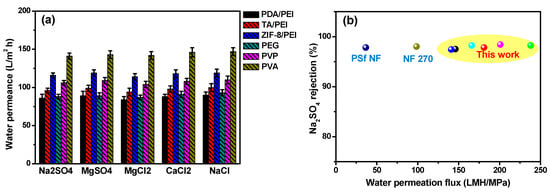 It was noticeable that the NF performances, including the water permeation and inorganic salts rejection rate, were usually the synergistic results of the polyamide layer thickness and their internal cross-linking degree. With the aim of obtaining the high membrane water permeation, the polyamide layer thickness was expected to be as thin as possible. Otherwise, for achieving the high inorganic salts rejection rate, the membrane internal high cross-linking degree was necessarily required. In our experiments, after the introduction of hydrophilic interlayers or adding of the macromolecular additives in the aqueous PIP solution, water permeation enhancements were noteworthy, which was in the order of ZIF-8/PEI > TA/PEI > PDA/PEI, with the hydrophilic interlayers on the modified porous substrates, and PVA > PVP > PEG for the doped polyamide membranes with macromolecular additives (as shown in