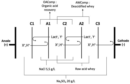 The ED configuration consisted of the stacking of five commercial food grade cation and anion exchange membranes (respectively CEM and AEM). Diluate (acid whey compartment: AWComp) and concentrate (organic acid recovery compartment: OAComp) solutions were circulated between the membranes defining three closed loops. The solutions used were a 20 g/L Na2SO4 electrolyte solution (volume of 2 L, flow rate of 4 L/min), a 5.5 g/L NaCl aqueous concentrate solution (2 L, 4 L/min), and acid whey (2 L, 4 L/min). To ensure a continuous recirculation, external tanks containing the solutions were connected to each closed loop. The closest CEM to the cathode (C3, see Figure 1) was added in order to avoid any anion migration in the electrolyte solution compartment, specifically lactate.