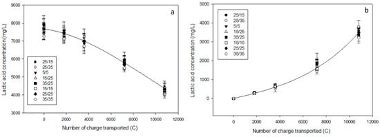 Evolution of lactic acid and lactate concentration (in mg/L) during electrodialysis in (a) the AWComp and (b) OAComp for all PEF conditions tested.