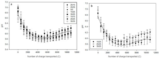 In the AWComp the pH decreased during ED from an average 4.43 ± 0.01 to 4.04 ± 0.03 (Figure 4) after 3 h of effective current application with no statistical difference between the eight different PEF conditions (P = 0.13). Among the conditions tested, the 15 s/25 s one had the lowest delta pH while the conditions 25 s/15 s and 35 s/25 s had the highest. Regarding the OAComp, the pH followed the same pattern for all conditions: it decreased until reaching a minimum value before a stationary state followed by an increasing phase around 5400 C (see Figure 5a). For all conditions, the initial pH was at an average 6.84 ± 0.08 and reached a final average of 6.07 ± 0.08 after 3 h of effective current application without statistical difference between conditions (P = 0.26). The condition with the lowest late pH increase was the 15 s/25 s condition. By only considering conditions assessing the pulse duration variation effect during PEF-ED, even if there was no statistical difference between their delta pH (P = 0.08), a tendency was observable: the longer the pulse time, the higher the final pH in the OAComp (Figure 5b).