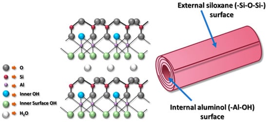 Halloysite (HNTs) is a type of 1D nano-sized clay minerals composed of aluminosilicate []. HNTs are naturally existing 1:1 multi-walled inorganic nanotubes built of tetrahedral (SiO) and octahedral (Al–OH) sheets, which has the chemical formula of Al2(OH)4Si2O5·nH2O []. It was shown that HNTs possess a combination of unique characteristics, such as tubular nanostructure, high aspect ratio, natural abundance, availability of functional groups, excellent biocompatibility, and strong mechanical strength [,,]. The length of HNTs varies from 200 to 2000 nm with its internal and external diameter ranging from 10 to 40 nm and 40 to 70 nm, respectively []. The difference between most clays and HNTs is that the aluminol sheets are found inside the tubular structure of HNTs. Figure 1 represents a schematic diagram of HNTs nanotube and its chemical structure.