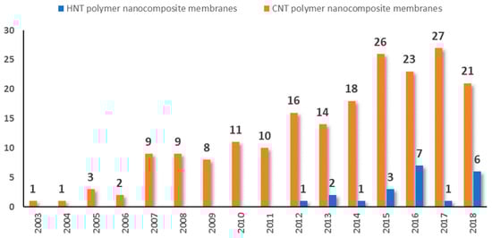 Even though research on HNTs-polymer based membranes in water treatment applications are starting to grow since the last few years, there is still a paucity of studies on HNTs/polymer-based membranes compared to research conducted on CNTs/polymer-based membranes. Figure 2 shows a comparison of the annual number of scientific publications on the CNTs and HNTs composite membranes.