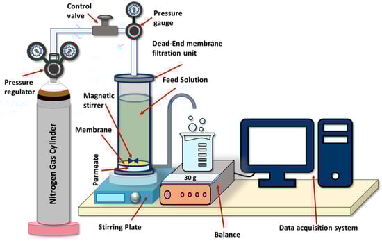 Membrane samples stored in DI water were thoroughly washed with DI water before using in a filtration test to remove any impurities. Pure water flux of the fabricated membranes was measured using a dead-end HP4750X stirred cell (Sterlitech, Kent, WA, USA). Nitrogen gas was used to pressurize feed solution inside the cell. Figure 4 shows a schematic representation of the bench scale filtration system used in the study.