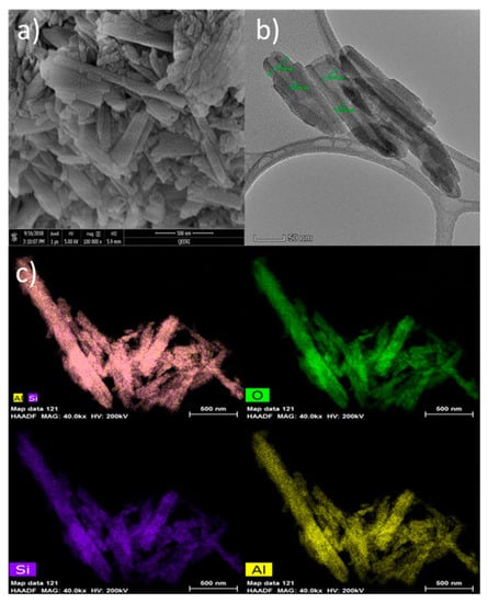 SEM and TEM images in Figure 5a,b show the tubular structure of HNTs samples with a well-defined empty and open-end lumen. The outer diameter for HNTs ranges from 44.6 to 45.8 nm and the inner diameter from 10.6 to 27.2 nm with a thickness of about 17.8 nm. Scanning transmission electron microscope (STEM) in combination with a high-angle annular dark-field imaging (HAADF) technique was used for elemental mapping of HNTs samples. As seen in Figure 5c, Si, Al, and O elements are uniformly distributed through the HNT nanoparticles.