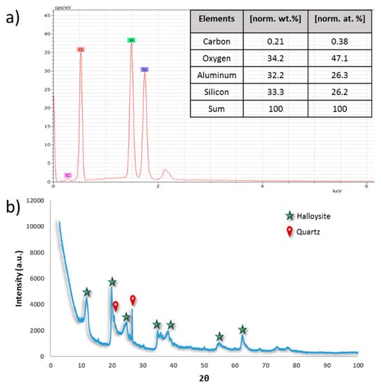 Elemental characterization using EDS (a), XRD at 2θ diffraction angle (b) for raw HNTs.