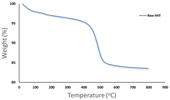 Figure 7 shows the results of thermogravimetric (TGA) analysis for HNTs. It has been observed that there is a preliminary mass loss between 0 and 150 °C for the HNTs samples due to the loss of adsorbed water located in the surface and between the rolled sheets of HNTs (interlayer water) [,]. Another major weight loss that happened between 400 to 550 °C could be attributed to the dehydroxylation of the structural water present in the AlOH groups []. The total mass loss of HNTs at 800 °C was found to be 16.1% weight loss with a residue mass of 83.9%.