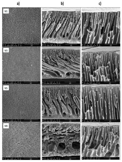 SEM images for: top surface (a), cross-section (b), enlarged top cross-section (c) for M1, M3, M5, M8, M9, M11, M13, M16 cast membranes.