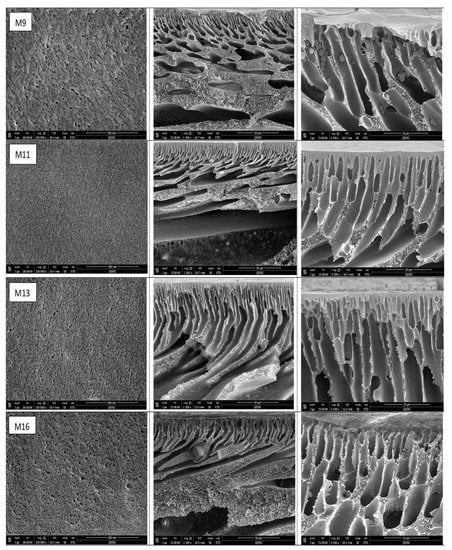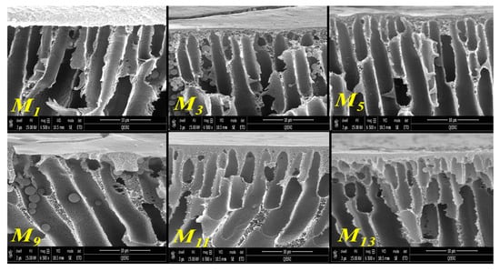 As can be seen in Figure 8c and Figure 10, the top skin-layer in M3 and M5 are slightly thicker than in the M1 sample. As discussed earlier, this could be attributed to more homogenous distribution and strong interaction of HNTs with PSF matrix, which reduces the solvent/nonsolvent exchange rate when low HNTs contents were incorporated. On the other hand, the top skin-layer became thinner for the M8 sample that has 5.0 wt % HNTs contents. At high HNTs loading, the hydrophilicity of the casting solution increases, and hence, the solvent/nonsolvent exchange rate also increases, which results in a thinner top skin layer. For the PSF/PVP system in Figure 10, a thicker top skin-layer when adding low HNTs content (M11 and M13) and thinner top skin-layer when adding high HNTs content (M16) were also observed. Interestingly, at the same HNTs loading, the top membrane’s skin layer for M11 and M13 samples from the PSF/PVP matrix is thicker than the top skin layer for M3 and M5 from the PSF matrix. Probably, due to the formation of some hydrogen bonds between PVP and HNTs, PVP facilitates the uniform distribution of HNTs within the casting solution and, thus, improves the nanotubes interaction with the PSF matrix.