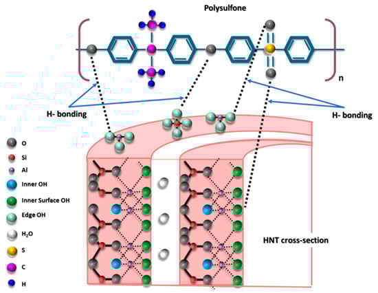 Schematic representation of probable sites of interactions between PSF and HNTs that could form hydrogen bonds.