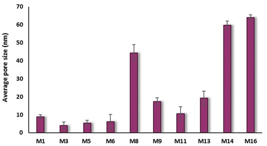 Data on pore size of the prepared membranes are presented in Figure 13. As seen in this figure, the membrane’s surface pore size varies between 4.0 and 44.3 nm for PSF/HNTs nanocomposite-based membranes and between 10.6 and 64.0 nm for PSF/PVP/HNTs nanocomposite-based membranes. The membrane pore size decreases at low HNTs content when HNTs are more homogenously distributed within both PSF and PSF/PVP matrices (M3, M5, M11, and M13 samples). At moderate HNTs contents of 1.0 wt % in both PSF and PSF/PVP matrices, the average pore size for M6 sample is less than for M1, while it is more in M14 than in M9. It might be assumed that PVP interaction with HNTs facilitates the migration of nanoparticles toward the membrane surface, which results in faster solvent/nonsolvent exchange and the formation of larger surface pores observed in M14. A sharp increase in pore size was observed for M8 and M16 samples when high content of HNTs (5.0 wt %) was added to PSF and PSF/PVP matrices, respectively.