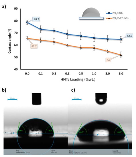 Water contact angle analysis for PSF/HNTs and PSF/PVP/HNTs membranes with different HNTs loading from 0.0 to 5.0 wt % (a), real water drop images for PSF membrane (b), and for PSF/5.0 wt % HNTs membrane (c).