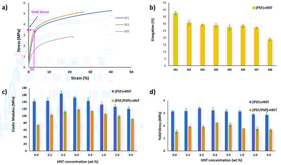 Stress–strain curves for M1, M3, and M9 (a), elongation at break for PSF/HNTs composite membranes (b), elastic modulus for all casted membranes (c), and yield stress for all casted membranes (d).