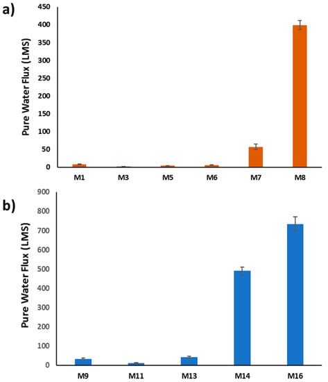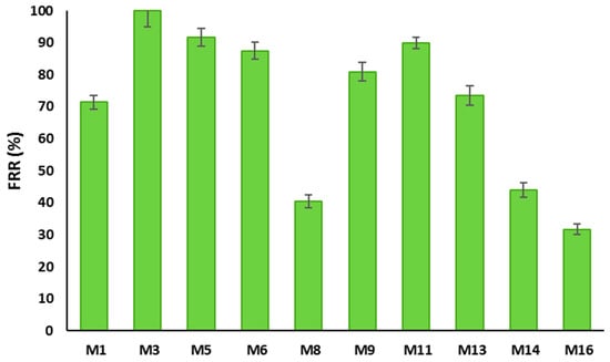 Flux recovery ratio (FRR) is often used to evaluate the membrane’s anti-fouling properties []. FRR values for the prepared PSF and PSF/PVP-based membranes are displayed in Figure 18. It can be seen from this figure that the FRR values for PSF/HNTS membranes range from 40.5 to 100%, while it ranges from 31.7 to 89.9% for PSF/PVP/HNTs-based membranes. It is observed that incorporation of HNTs into both membrane matrices initially increased the FRR values and then a gradual decrease took place as the HNTs content increased. The M3 sample was able to restore 100% of the flux after being subjected to BSA filtration compared to 71.4% for the pristine membrane (M1). M5 and M6 also show higher recoveries of 91.7% and 84.6%, respectively, which are both higher than the recovery ratio for the plain PSF membrane (M1). This is obviously due to the improved hydrophilicity of the PSF/HNTs membrane samples. However, the FRR for the M8 sample has been reduced to 40.5% obviously due to its larger pore size, which allows BSA molecules to be absorbed and entrapped inside the membrane porous structure and within the HNTs aggregates []. The low FRR value for the M8 membrane is consistent with its relatively high rejection observed in Figure 17. The same trend in increasing FRR values at lower HNTs contents and decreasing FRR values at higher HNTs content was observed for PSF/PVP based membranes.