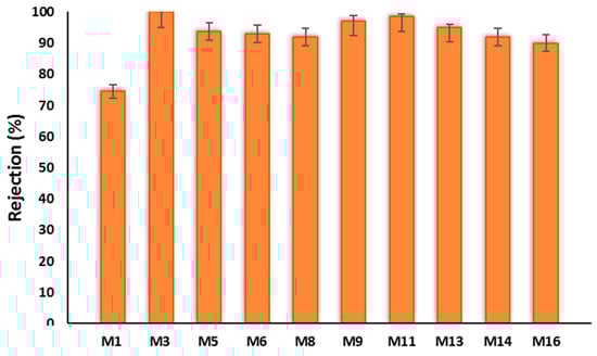 The same dead-end filtration set-up was used to filter a 100 mg/L BSA solution prepared in DI water. BSA was used as a protein fouling model to investigate the anti-fouling and rejection capacity of the prepared membranes. BSA rejection (R) of membranes was calculated using Equation (4) [].