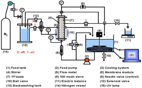 Recently, the hybrid technology of membrane separation and photooxidation by UV irradiation has effectively solved the above-mentioned membrane fouling problem [5]. Hybrid technology not only maintains the advantages of each technology, but also produces synergistic effects that overcome the limits of only one technology of membrane separation and photooxidation. In addition, pollutants such as NOM can be oxidized by UV irradiation, and organic species are rejected partially by controlling the residence time in the reacting system. In other words, the membrane is also a selective barrier for the separated molecules. Finally, hybrid technology increases photooxidation efficiency and acquires excellent effluent quality. The effect of UV-irradiation on the nano-hybrid PES-NanoZnO membrane in terms of flux and rejection efficiency has also been discussed in [6]. In addition, a comparison of the efficiency of surface water treatment in hybrid systems by coupling various advanced oxidation processes and ultrafiltration (UF) was presented by [7]. In this study, a hybrid process of ceramic membrane and pure PP beads with UV irradiation was applied for advanced water treatment.