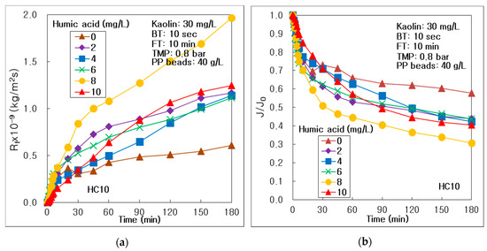 In the previous result by [23] for the hybrid process of the C005 and the pure PP beads, the Rf,180 after 180 min was the highest of 4.892 × 109 kg/m2s at 50 g/L, which was 1.48 times higher than 3.306 × 109 kg/m2s of the Rf,180 at 0 g/L of PP beads. These Rf,180 were much higher than those of HC10 in this study; however, the trends depending on PP beads concentration was exactly the same in this hybrid process. Additionally, the Rrf increased with an increasing PP beads concentration from 0 g/L to 50 g/L of PP beads; however, the Rif was the minimum at 50 g/L and the maximum at 10 g/L of PP beads. This result was also almost in agreement with that of this study using HC10.