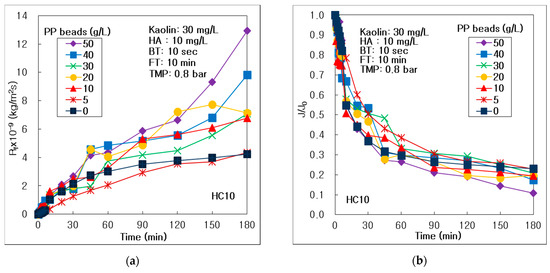 The J/J0 was compared to investigate the effect of PP beads on the relative decline of permeate flux, as shown in Figure 3b. The J/J0 maintained higher until 90 min at PP beads 5 g/L than those at other PP beads concentration, and showed the lowest at PP beads 50 g/L after 60 min. As arranged in Table 5, the J0 and J180 decreased to 40 g/L and to 50 g/L, respectively, with an increase in PP beads concentration, because the Rb and Rf increased to 40 g/L and to 50 g/L of PP beads, correspondingly. Finally, the J180/J0 after 180 min of operation at 0 g/L of the PP beads was the maximum 0.230, which was 2.13 times higher than 0.108 at 50 g/L. However, the VT was the highest, 11.75 L at 5 g/L of PP beads, because J maintained higher all through the operation than those of other PP beads conditions.