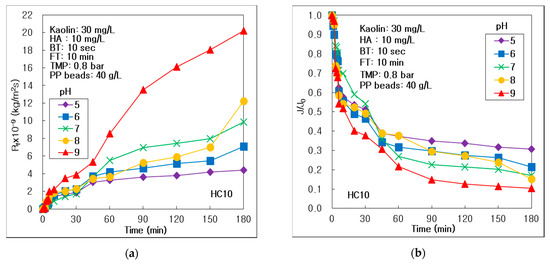 In the previous result by [23] for the hybrid process of the C005 and the pure PP beads, the Rf showed the highest at a pH of 9 after 90 min and the lowest at a pH of 5 after 150 min, and finally have a trend to increase, with an increase in pH from 5 to 9. This result agreeds exactly with that in the hybrid process of HC10 in this study. The Rb and Rif were the minimum at a pH of 5; however, the Rf,180 and Rrf were the lowest at a pH of 6. However, this trend did not match the result for HC10 in this study. Conclusively, the Rf,180 was the highest, 5.51 × 109 kg/m2s, at a pH of 9, which was 1.32 times higher than 4.16 × 109 kg/m2s at a pH of 6. The Rrf and Rif were the maximum at pH 9. The increasing rate, i.e., 1.32 of Rf,180 for C005 was much lower than 4.58 for HC10, because pH controlled more effectively the membrane fouling in the hybrid process of HC10 than C005.