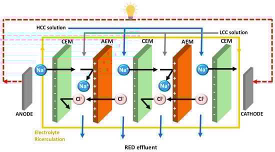 One of the most promising membrane-based technologies for harnessing SGP is reverse electrodialysis (RED), which is currently at an advanced stage of development. In RED, cation exchange membranes (CEMs) and anion exchange membranes (AEMs) are aligned in alternative ways to create a series of adjacent compartments, termed as “high concentration compartments (HCCs)” and “low concentration compartments (LCCs)” (Figure 1). The compartments are separated by spacer materials which provide a space between the membranes, thereby allowing mixing of the salt solutions. When these compartments are supplied with respective high concentration solutions and low concentration solutions, a potential gradient is created that drives the selective transport of ions through the membranes. The electrode connected to the external circuit allows conversion of the ionic flux into electricity [3].