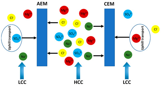 where ai is the activity of the ionic species. For instance, assuming a CEM separating artificial seawater and river water solutions containing mixtures of only NaCl + MgSO4 salts (Figure 3), and considering ai of unity, then it appears from Equation (17) that the ENa+ (z = 1) is twice the voltage of EMg2+ (z = 2). In other words, the salinity ratio of the monovalent ions creates twice the voltage generated by the same salinity ratio of divalent ions, assuming that the ai and α remain constant. Under the OCV conditions, a higher voltage of Na+ forces Mg2+ to be transported from the river water to the seawater to maintain the electroneutrality that is disrupted due to the initial high transport rate of Na+ from HCC to LCC. This process is termed as uphill transport, in which two Na+ ions are transported in the opposite direction to the Mg2+ ions [5,6,7,8,24,25,26,27]. The Na+ and Mg2+ start moving until the overall Ei is balanced, reaching an equilibrium (ENa+ = EMg2+); at this point, the uphill transport stops, defined as