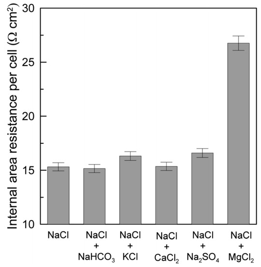 Variation in internal area resistance per cell with the composition of the feed solutions (single membrane area: 100 cm2; number of cell pairs: 25). Reproduced with permission from [9]. Copyright 2014 Royal Society of Chemistry.