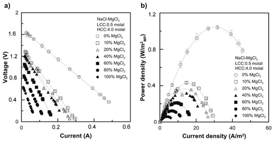 (a) Polarization curves (Voltage (V) vs. current (I)) and (b) gross power density (Pd) as a function of current density for RED tests using multivalent ions (NaCl/MgCl2) of different molal compositions. In pure MgCl2 solution, the power density and the OCV decreased by 94% and 57%, respectively, with respect to pure NaCl solution. Reproduced with permission from [5]. Copyright 2016 Elsevier.