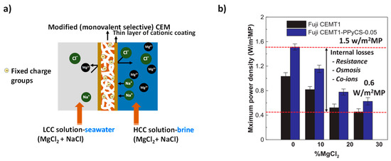 (a) Mitigation of uphill transport using monovalent selective cation exchange membrane. LCC: low concentration solution; HCC high concentration solution; CEM: cation exchange membrane. (b) Enhancement in OCV and power density with the monovalent selective membranes based on polypyrrole/chitosan composites. Reproduced with permission from [39]. Copyright 2016 Elsevier.