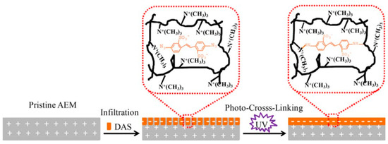 Surface modification of an anion exchange membrane (AEM) by infiltration and photo-cross-linking using 4,4-diazostilbene-2,2-disulfonic acid disodium salt (DAS). The azido group in DAS reacted to a nitrene group under UV irradiation which immobilized it on the membrane surface, thereby creating covalent cross-linking: The sulfonate group facilitated the water solubility and infiltration into the surface layer structure of the membrane, providing the negative charge groups and also improving the monovalent anion selectivity. Reproduced with permission from [57]. Copyrights 2018 American Institute of Chemical Engineers.