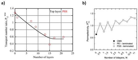 (a) The transport number ratio of SO42− and Cl− ions in ED as a function of the number of layers for the AMX membrane modified with PSS end layers [51]. (b) Variations in the permselectivity of the Neosepta CMX with the number of PEI/PSS bilayers [54]. Reproduced with permission from [51,54]. Copyright 2013, Elsevier, and copyright 2014, American Chemical Society.