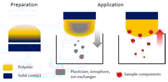 Classical operation mode of ISM-based sensors is equilibrium mode, ion-exchange occurring between the membrane and the sample is driven by the preference of analyte ions in the ISM phase (typically achieved due to complexation with ionophore) [1,2]; although electrochemical trigger applications (non-equilibrium mode) of ISMs have been also proposed [16]. It is generally accepted that optimal analytical performance of the membrane requires that composition of the phase is well defined by the application of tailored amounts of the defined components during preparation. It is assumed that the intended composition of the membrane is maintained through the sensor’s lifetime, with only one exception. In most of cases incorporation of the primary ions (to as prepared membrane) in the pre-treatment step occurs, which is needed to assure stable performance of the sensor.