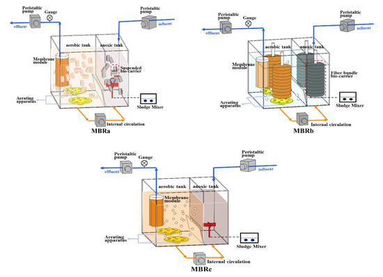 The three reactors (designed as MBRa, MBRb, and MBRc) were setup in parallel in this study (Figure 1). In all bioreactors, the experiments were carried out in aerobic tanks (12 L) and an anoxic tank (6 L). The ultrafiltration membrane module was from Lanjinquan, Shanghai Yule Industry and Trade Co., Ltd., China MBRb was equipped with two fiber bundle carriers (Yulong, Jiangsu, China) consisted of a rope wrapped with a polyvinylidene fluoride fiber bundle. The suspended carriers (Yulong, Jiangsu, China) in MBRa were hollow cylinders made of polypropylene. The effective specific surface area of these carriers is 1200 m2/m3. The details and packing density of the fiber bundle bio-carrier and suspended bio-carrier, and the operating conditions were described in a previous study [20]. The pre-anoxic tank in three AO-MBRs could improve denitrification ability. During the operation, a large amount of biomass was adsorbed onto the biofilm of the fiber bundle carrier. Compared to the MBRc, the reactors with carriers had higher biomass content, which means that bio-carriers improved the growth of microorganisms. The sludge reflux ratio from aerobic tank to anoxic tank was 150%. Three MBRs were operated under a sludge retention time (SRT) of 52 days, with a hydraulic retention time (HRT) of 18 h. Dissolved oxygen in the aerobic tank was 2.7 (±0.5) mg/L.