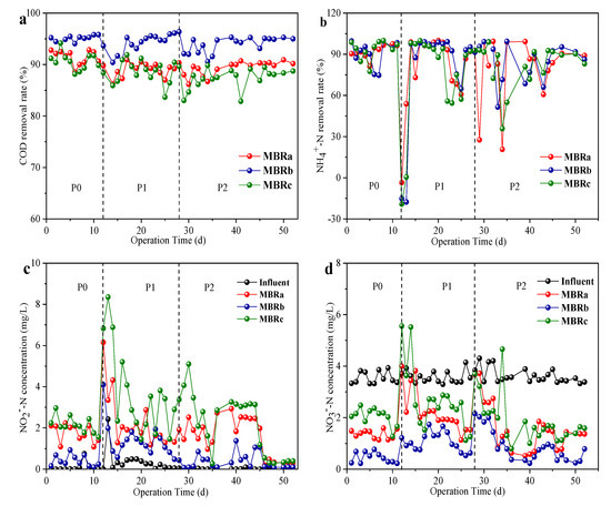 As shown in Figure 2a, the addition of TC and NOR had little effect on the COD removal compared to the reactor performance in phase 0 (without antibiotics). The average COD removal rate was maintained at 91.24 ± 1.35%, 95.13 ± 0.66% and 90.21 ± 1.66% in phase 0, and 88.89 ± 1.32%, 95.57 ± 1.82% and 88.01 ± 2.18% in phase 1, and 90.29 ± 1.40%, 95.05 ± 1.47% and 88.57 ± 1.95% in phase 2 in MBRa, MBRb, and MBRc during the entire operation, respectively. The results indicate that all reactors had the high removal efficiency of organic matter, and the COD removal efficiency of the MBRb reactor was a bit higher than that of the MBRa reactor and MBRc reactor throughout the operation. The results were consistent with those of previous studies, indicating that ≤20 mg/L antibiotics had no effect on the elimination of COD [25].
