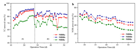 Figure 3 showed the removal of antibiotics in the three reactors at different operating stages. The three reactors shared a similar trend. The removal rates of TC first increased from 73.86% to 89.77% in MBRa, 78.15% to 91.65% in MBRb and 62.36% to 81.07% in MBRc at 16 days, and then quickly decreased to 78.0% in MBRa, 83.01% in MBRb and 63.25% in MBRc at 22 days. Note that the removal rates of TC rose sharply in the first 10 days. The reason might be that adsorption played a main role in the early process. The adsorption of TC occurred quickly at the start and almost achieved the maximum adsorption capacity after 10 days [31]. With the increase in time, microorganisms gradually adapted to TC in the system, and then its biodegradation dominated later. Subsequently, the removal rate of TC decreased with the addition of NOR. The performance of MBRa and MBRb was superior to MBRc, and MBRb showed the best effect on TC removal. The importance of biodegradation on the removal of this antibiotic was also shown [32], since they suggested that the removal of TC was characterized by a rapid adsorption and slow biodegradation process. These systems were operated by having very long SRT and acclimation potential, which might contribute to the degradation process of TC. The removal rate of TC was very high during the whole experiment.