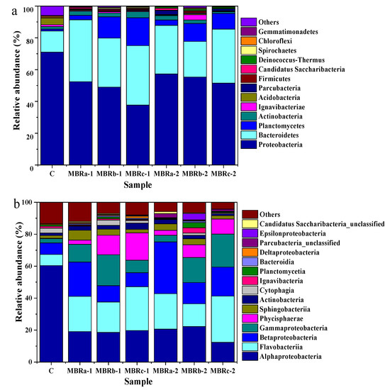 Microbial community structure in sludge samples in P0 (C) in MBRc, and P1 (MBRa-1, MBRb-1 and MBRc-1) and P2 (MBRa-2, MBRb-2 and MBRc-2). Results are shown at the (a) phylum level and (b) class levels.