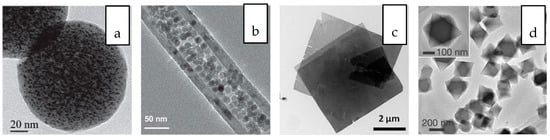 Transmission electron microscope (TEM) images of (a) 0D platinum loaded N-doped mesoporous carbon nanosphere [34], (b) 1D iron oxide nanoparticle filled carbon nanotube [35], (c) 2D metal organic framework nanosheet [36] and (d) 3D platinum loaded in between a MIL-101(Cr) core and MIL-101(Fe) shell [37].